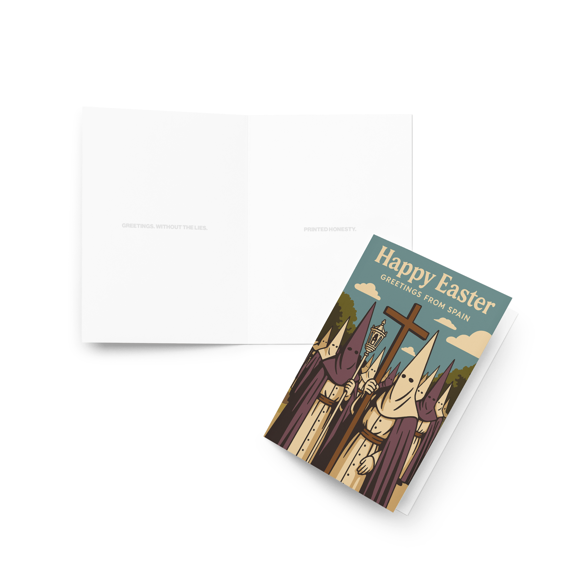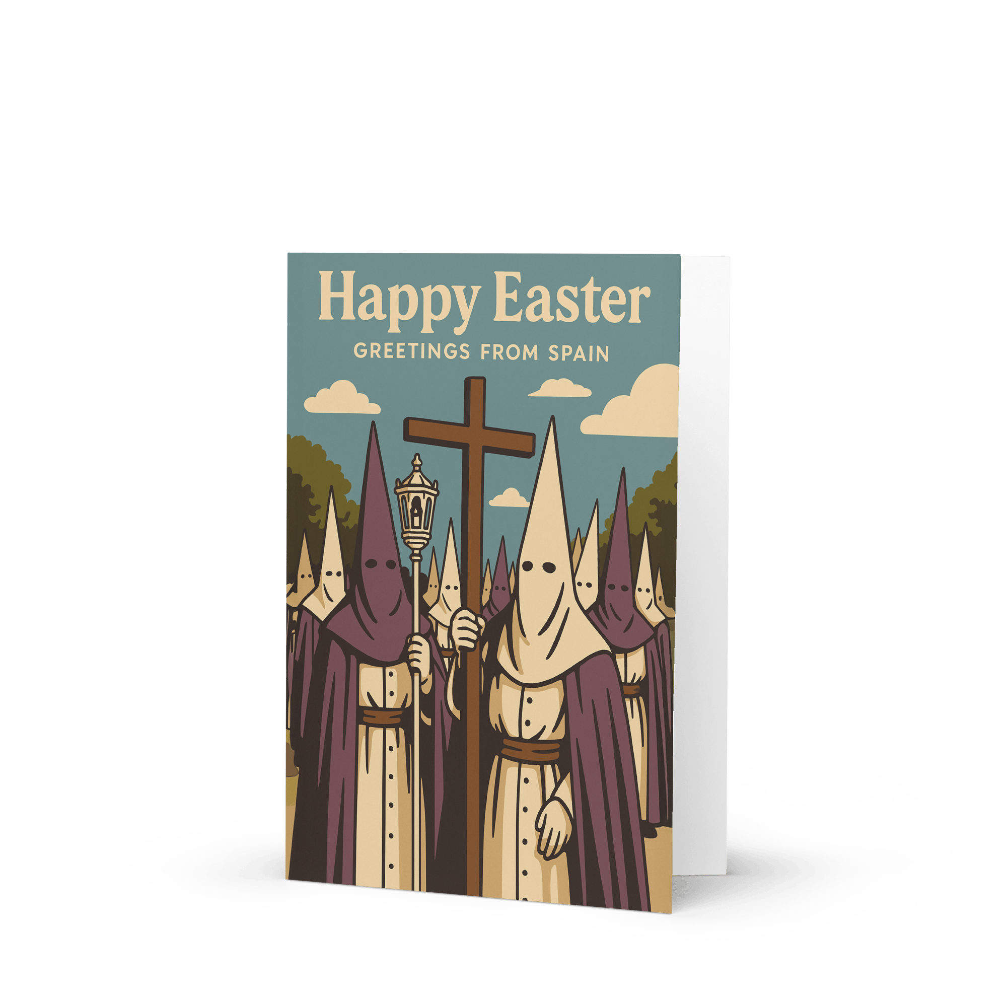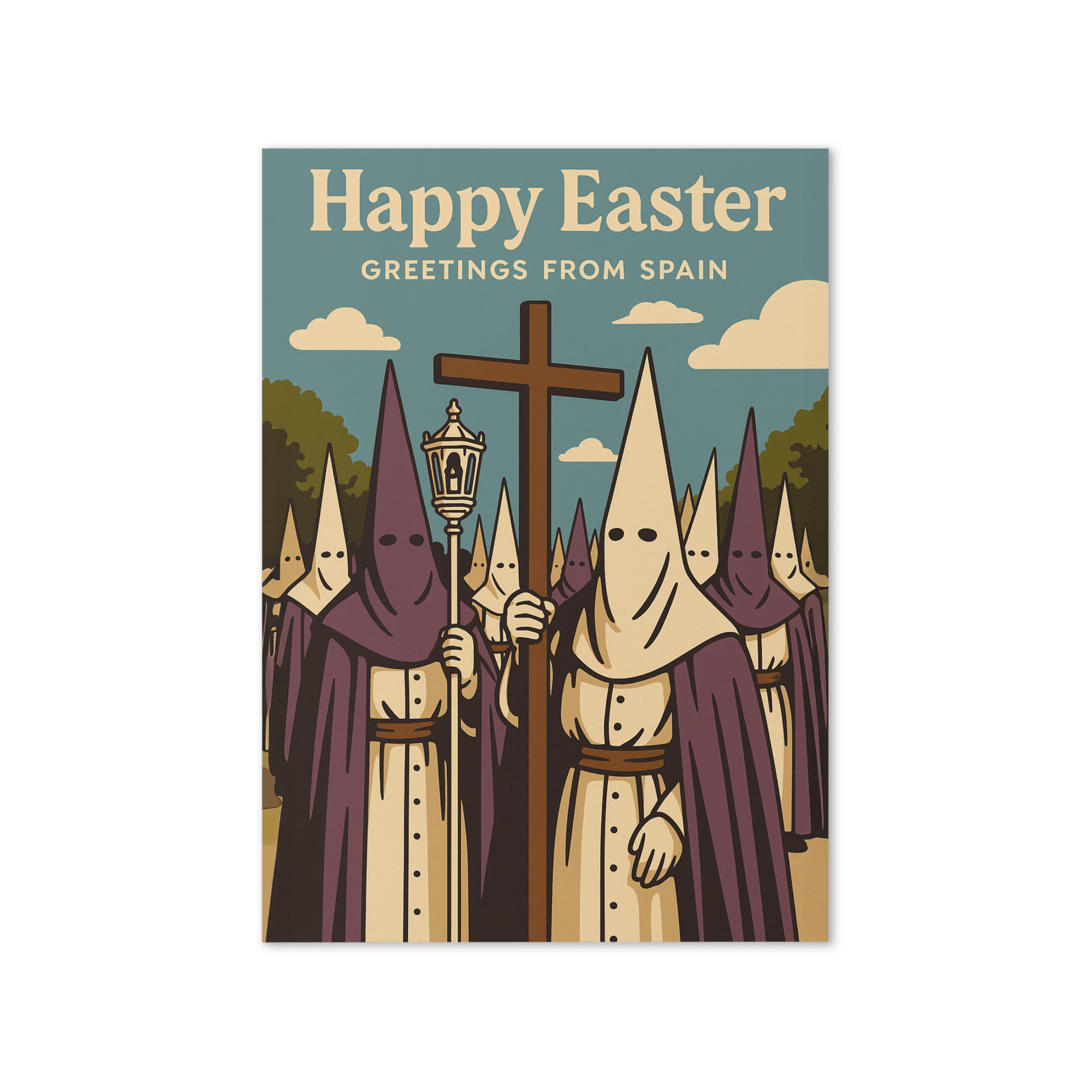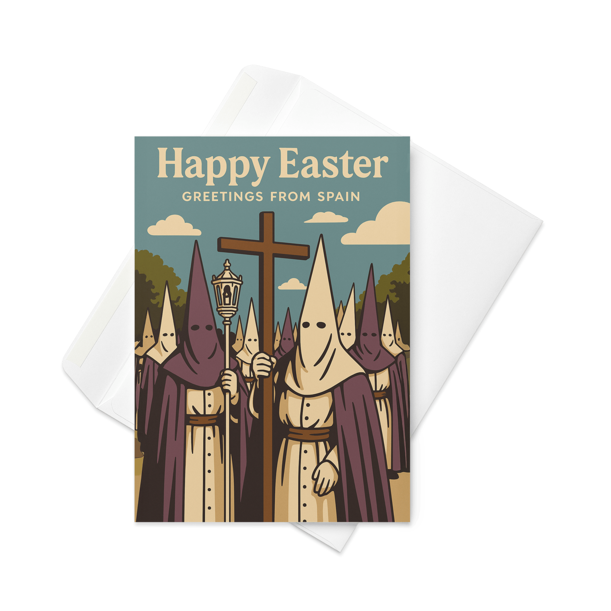 Easter hits different in Spain. Incense, chaos, costumes, and... spiritual confusion. Send your love the traditional way: dramatically and without explanation.